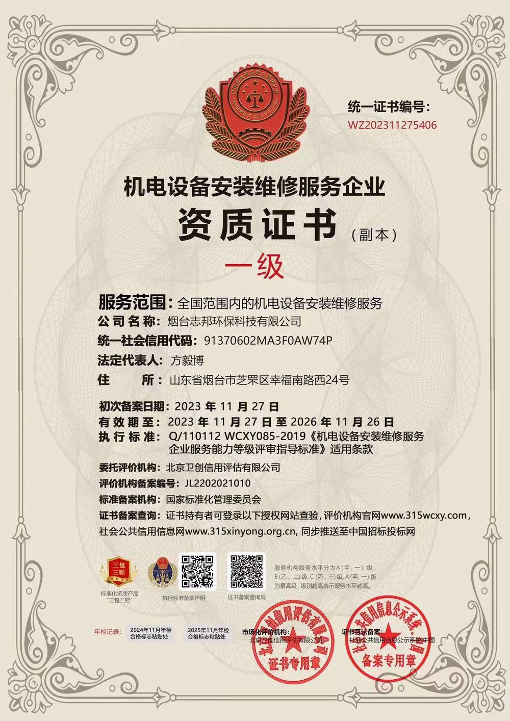 機(jī)電設(shè)備安裝維修服務(wù)企業(yè)資質(zhì)證書 一級